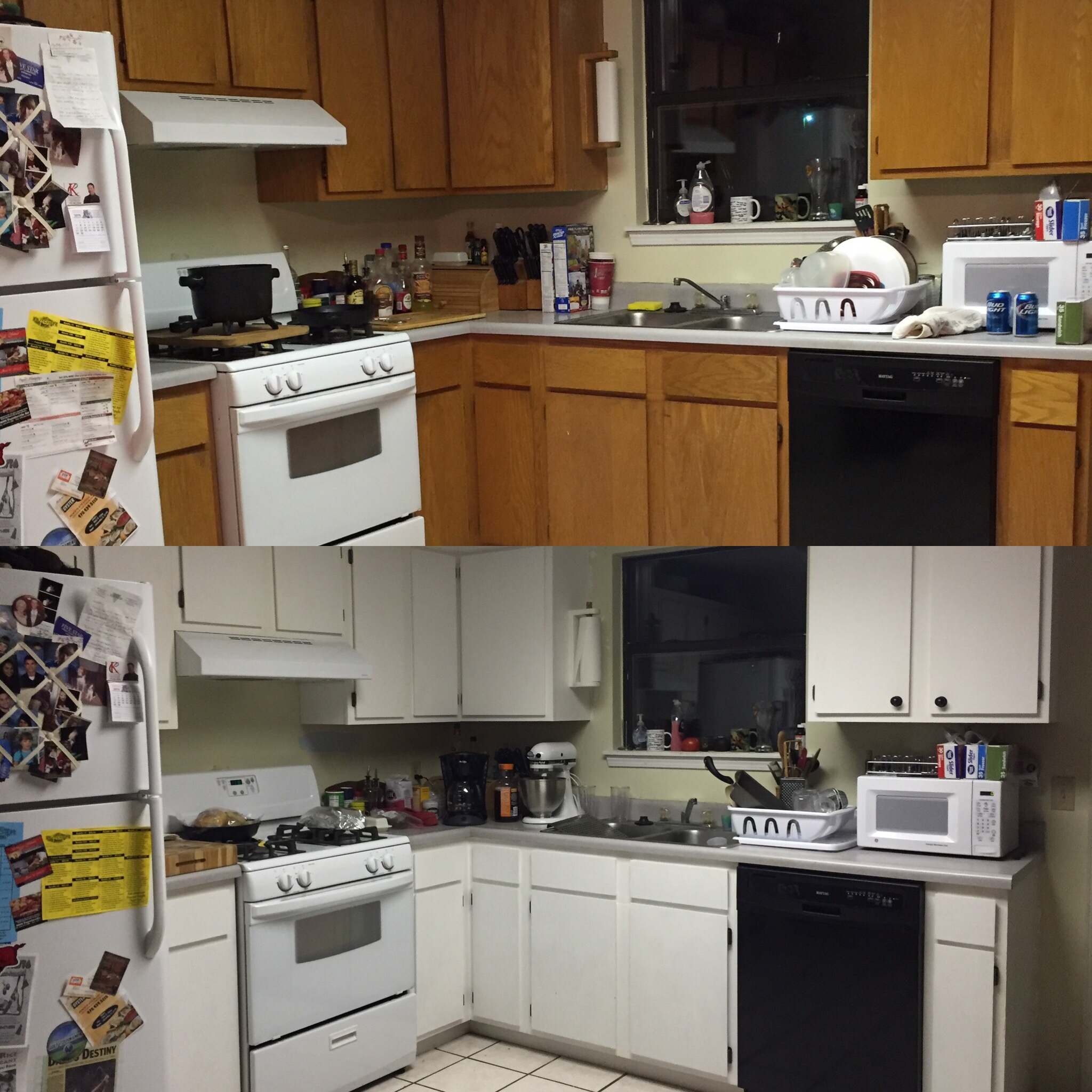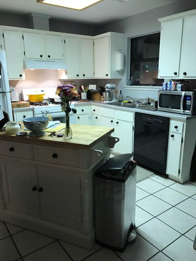 It ended up taking us about 1 month to finish completely. Overall, I loved how it came out. The white really made the small kitchen look bigger and made the room feel so much brighter. We next added some hardware we bought from Lowe’s for $4 a piece. We also bought an island to put in the middle of the kitchen because we desperately needed more counter space and storage. I wanted one that had two drawers and opened on both sides. I also wanted one that had a solid wood countertop. After a ton of research and waiting on the right price, I bought an island from Bed, Bath and Beyond for around $600 on sale and changed the cheap knobs on it with the same ones we did for our cabinets so it looked more cohesive. One thing I took away from this whole process was that painting cabinets is hard work and I way underestimate how much time a project like this will actually take. I would not trade the outcome though! Here is what it looked like when we were finished. What a before and after!