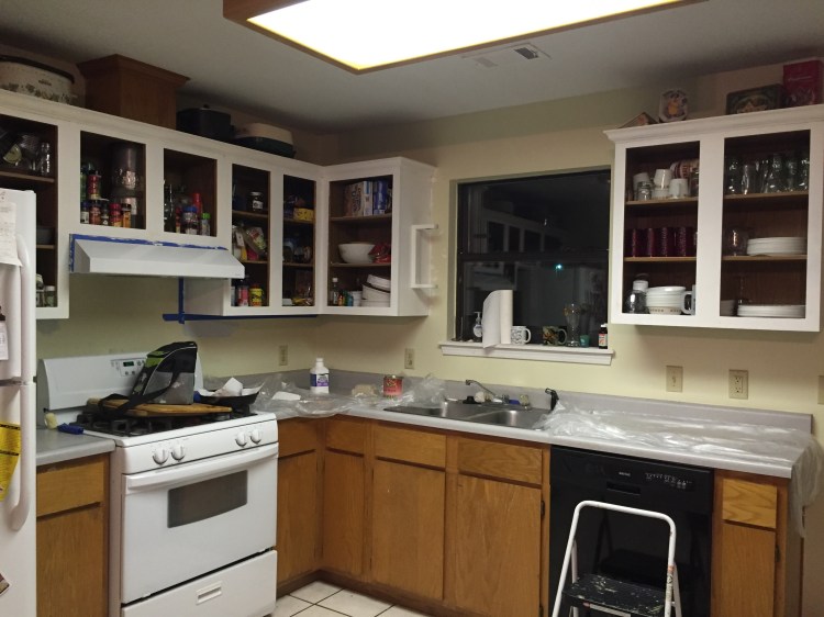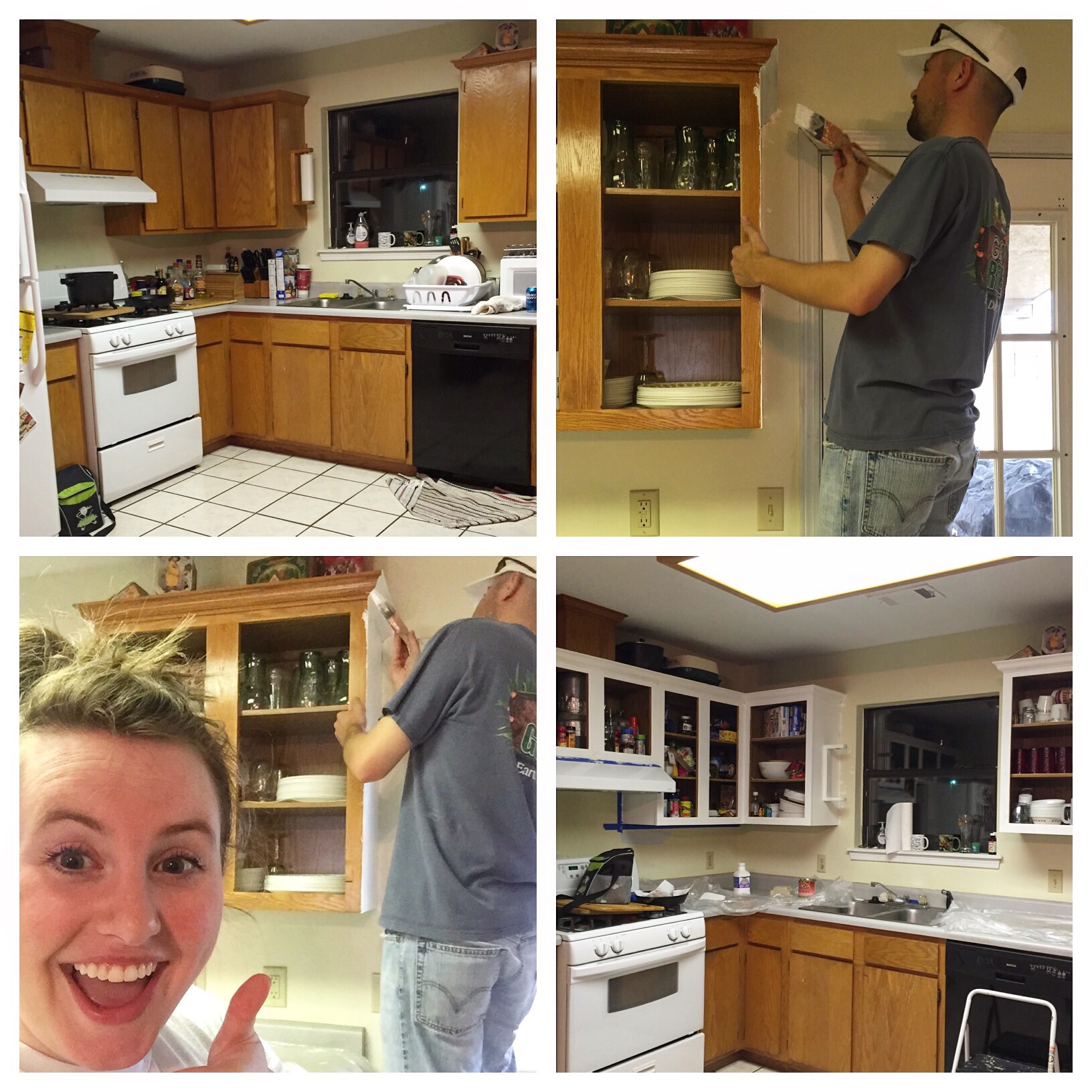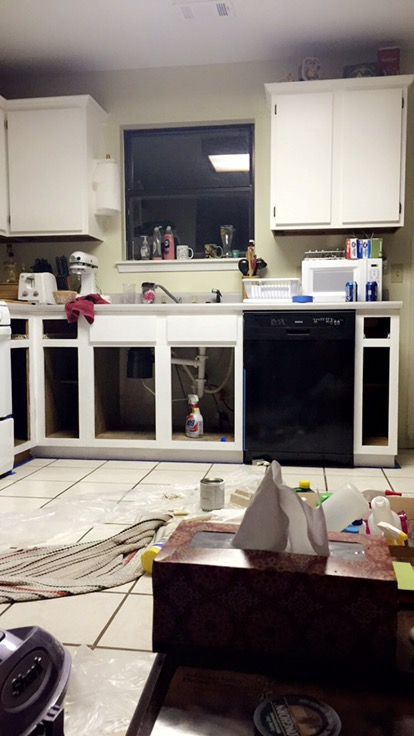 While the cabinets were not the worst, I hated them, so I started doing research on the best way to paint cabinets and convince Andrew that this was a MUST on our to do list for the house. It wasn’t an option for us to spend the money on getting new cabinets so painting them was a cost effective way to get the look I wanted. Let me start by saying that we did this project while we were in premarital counseling. Make sure your communication is on a high point when you start a tedious project like this. Also notice how excited I looked at the beginning haha! I also thought that we could paint them all in one day. That was funny. After researching different methods, I settled on a milk paint by General Finishes in a color called Snow White. We chose milk paint because it didn’t require sanding and priming, so we thought it would save a lot of time. In the end, I would say it is pretty much a wash on time. The milk paint called for a coat of deglosser which we bought at Lowe’s for about $7. A little bit goes a LONG way. This basically took off the finish that was on the cabinets and prepped them so the paint would stick better to them. It will be sticky, just warning you. When you take off the doors of your cabinets make sure you label them by number of where they came from. Even if they look the same size they might not be and when you are hanging them back up they might not match without labeling. We also put all the screws and hinges in bags labeled for each door. Next we started the painting process. It took 2 to 3 coats of the milk paint and then 2 coats of the General Finishes High Performance Top Coat in Flat. This sealed the paint and as Andrew says, this process gave it a different look then just painting it. To save money we also decided to paint the henges and screws to make them match the knobs we picked out. I cleaned them really well then set them on news paper and sprayed them down with spray paint by Rust-Oleum in a brown hammered color. It was less than $6 and looked GREAT!!