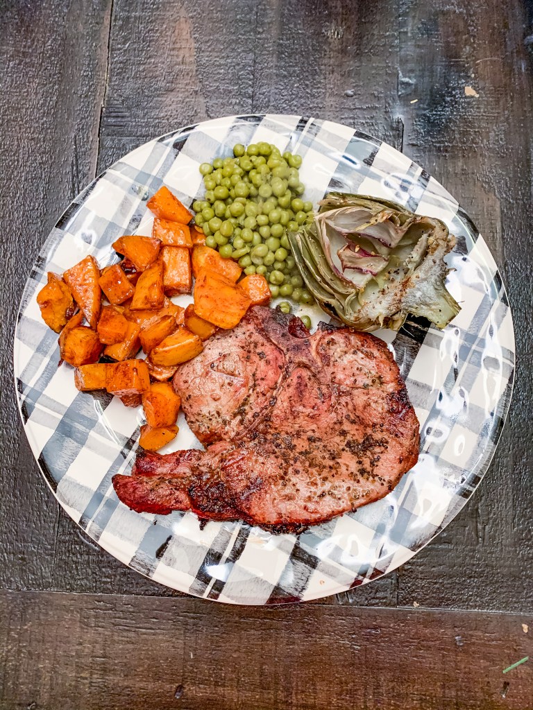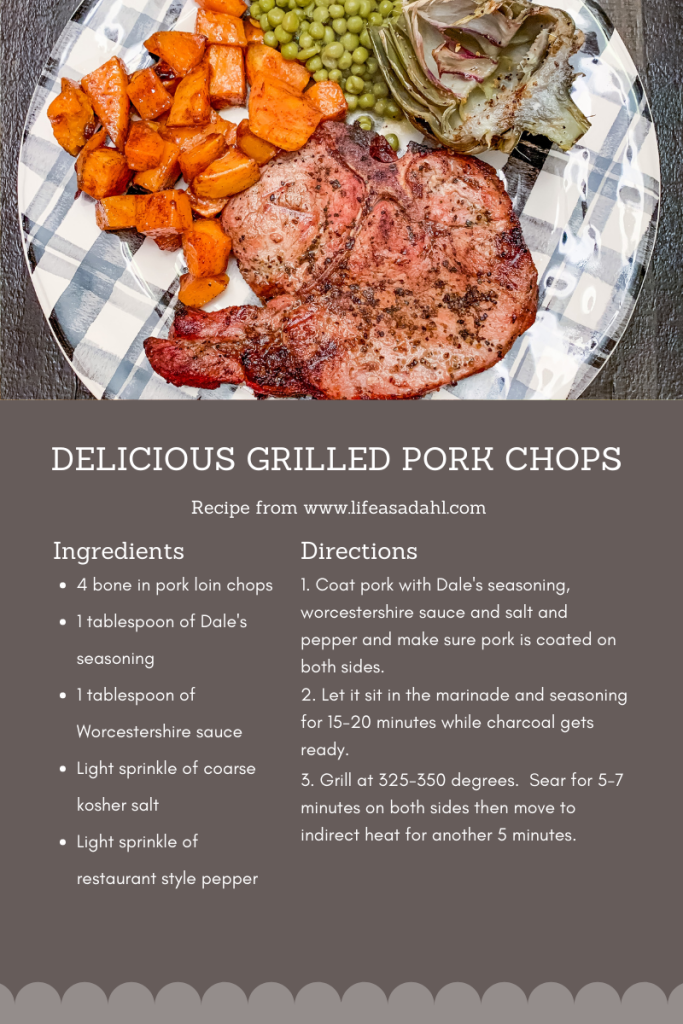 Need a restaurant quality meal within 40 minutes for less than $4 a person. This is it. When looking ahead at the week and planning meals, we always like to plan for meals like pork chops on days we know will be long or days where we just need to get a meal on the table quickly. Andrew threw these together tonight and they were delicious. You can pair the pork with whatever you would like. Tonight I made roasted sweet potatoes, green peas and artichokes. Not only do we love them but our two year old little boy couldn’t get enough. Try grilling these pork chops and let us know what you think!