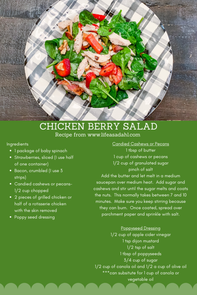 For the first 12 years of my life I grew up in the small town of Russellville, AR. There wasn’t a lot to do in the town and if you wanted to go to eat “fancy”, you typically drove to Little Rock. I distinctly remember one of my friends coming to school in the 5th grade boasting all about going to eat at this restaurant in Conway called Marketplace. I remember it specifically because she said they lit the cheese dip on fire and when you are in 5th grade that is not only impressive but an add to your bucket list. A little less than a year later my family moved to Fort Smith and low and behold, Fort Smith had a Marketplace!!! So of course I begged my mom to go try this flaming queso and while it wasn’t the best cheese experience I’ve ever had, the ambiance it brought was worth the try. Over the next few years we would frequent the restaurant specially when they offered their free kids meals. But the thing I remember the most about the infamous restaurant is their chicken berry salad. My mom and I would split this salad of spinach, chicken, nuts and strawberries and it made a salad fan out of me. Now, years later, the restaurant itself has moved on to become a pizza place but the memories of this delectable dish have caused me to create my own version. Andrew and I love this salad specifically in the spring. It is delicious and I hope you enjoy it as much as we do!